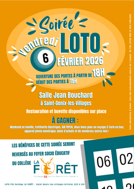 Par admin foret, publié le jeudi 5 février 2026 15:22 - Mis à jour le jeudi 5 février 2026 15:27Loto du collège ce vendredi 06/02. VENEZ nombreux et nombreuses ! -