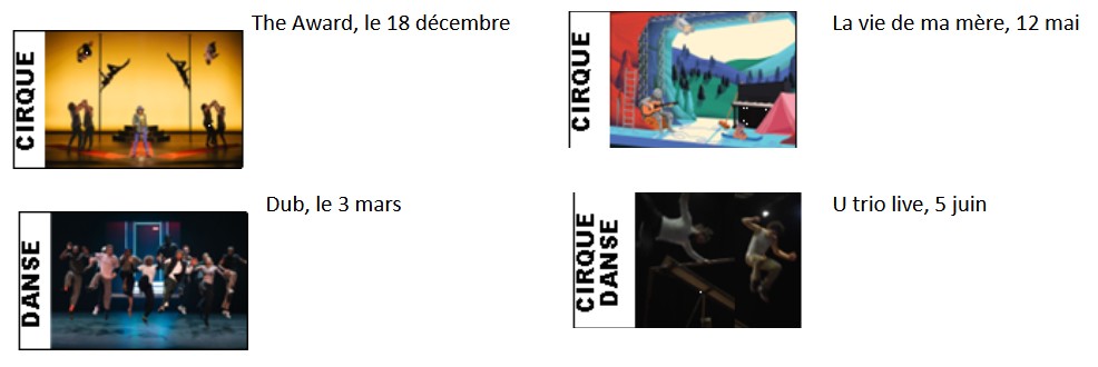 Quatre spectacles sont proposés : The Award, le 18 décembre // La vie de ma mère, 12 mai // Dub, le 3 mars // U trio live, 5 juin
