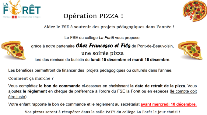 Ces niveaux peuvent quand même commander des pizzas si vous le souhaitez pour le jeudi 2 avril. Il faudra bien penser à venir les chercher.